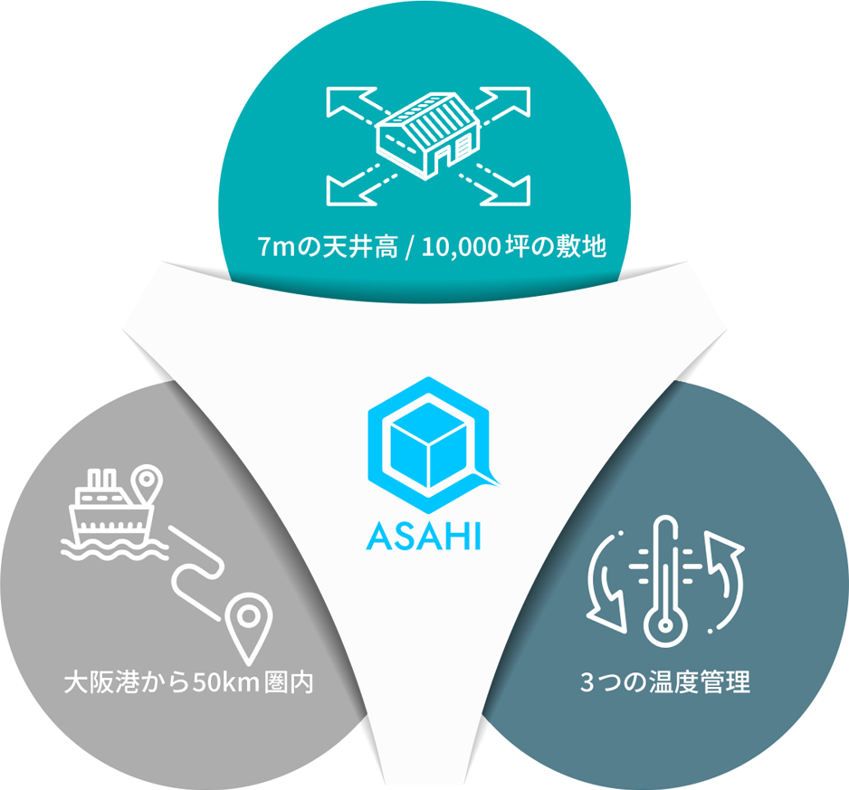7mの天井高と10,000坪の広大な敷地が織りなす、3つの温度管理施設。常温はもちろん、低温から冷凍まで広範な要件に対応。そして、大阪港からわずか50km圏内での最適なドレージ料金。